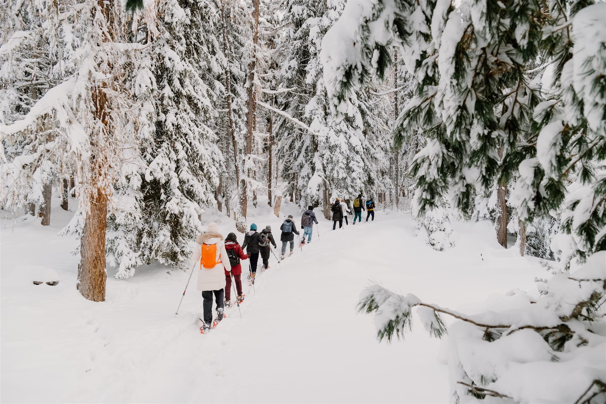 Every day there is an outdoor moment in Nature. Nature is there not only to be seen, but also to be experienced and it offers a unique medium to reconnect with ourselves, by reconnecting with her. The first thing people recognize in Nature is its pace. In Nature nothing is rushed and nothing is still, but everything moves. By moving at the speed of Nature we become more aware of our body sensations, such as thirst and hunger, but also we become more aware of our role in Nature. As we walk, hike and breathe in Nature we engage in a few practices that focus on introspection, group dynamics or teamwork. As we return to our chalet, everybody is sufficiently tired to enjoy personal care, resting, journaling, or taking advantage of the facilities. We often have a Sauna or an outdoor hot tub in our places, and that's also a bonding moment for people to reflect about the day.